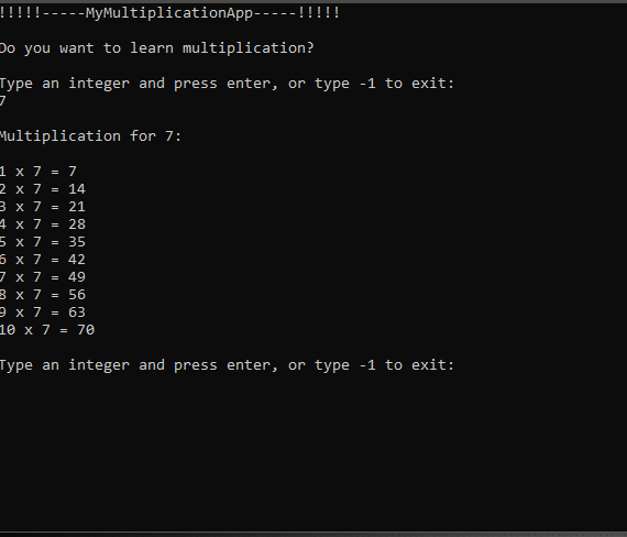 This is a simple console application that helps users practice multiplication.
